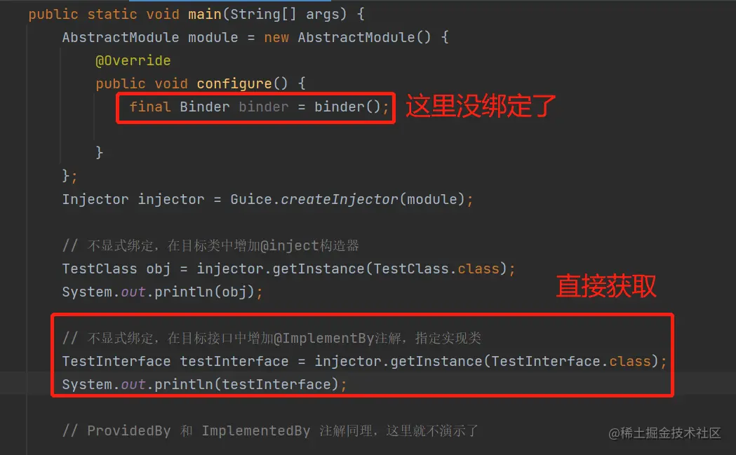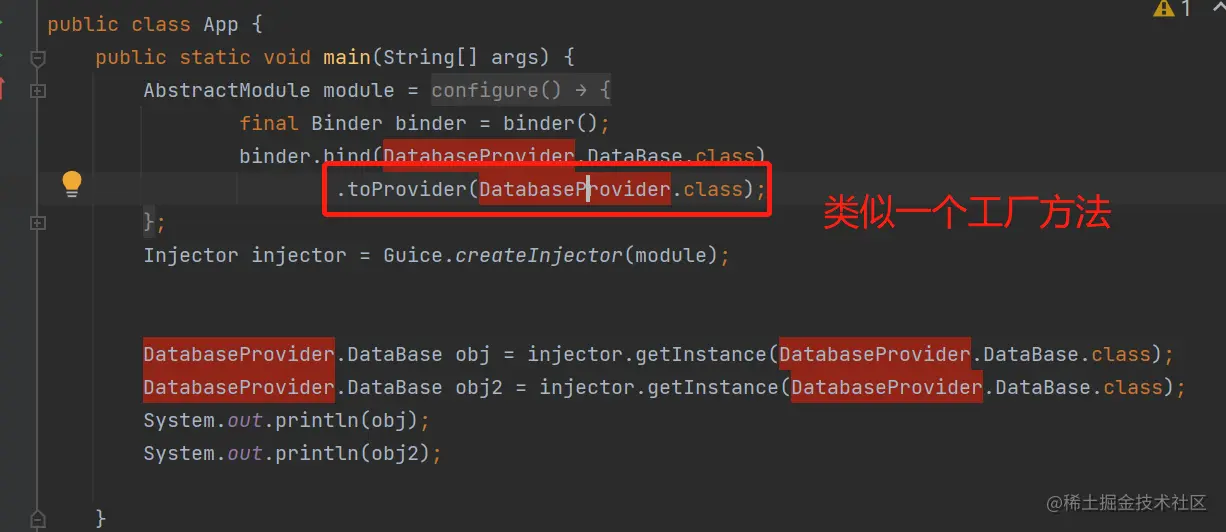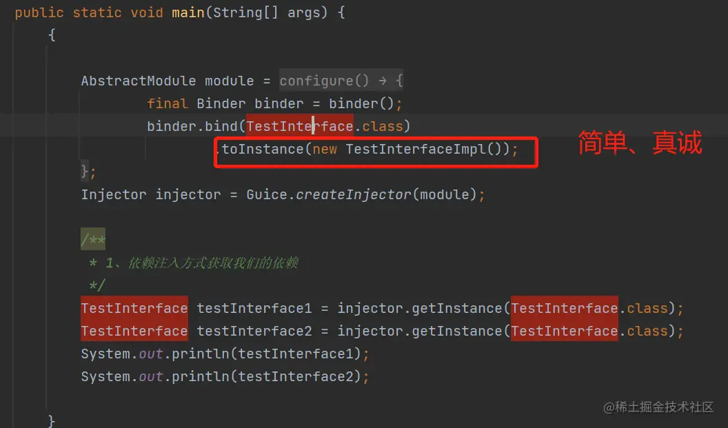 可以看出,Guice是很轻量,轻量的意思是,功能没Spring那么全,所以,我们还需要去显式地:配置每个接口,要怎么获取它的对象(方法也是五花八门,哈哈哈,如前面展示的)。
