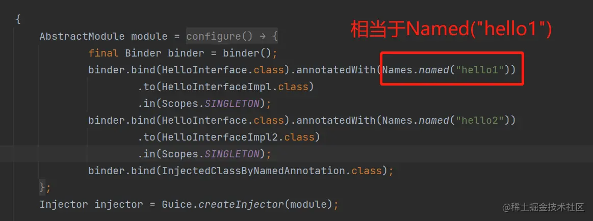Guice有个注解,叫Named,可以加在各种地方,注解本身,支持设置名称。