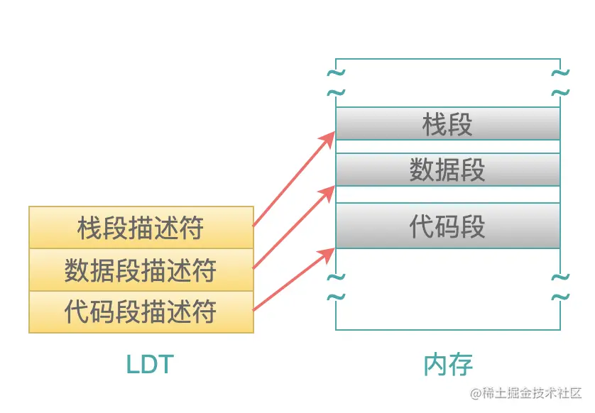 原因是这样的:我们在执行一段代码之前,这段代码位于内存中的一段空间中,而它的代码段描述符位于LDT局部描述符表中,如下图所示: