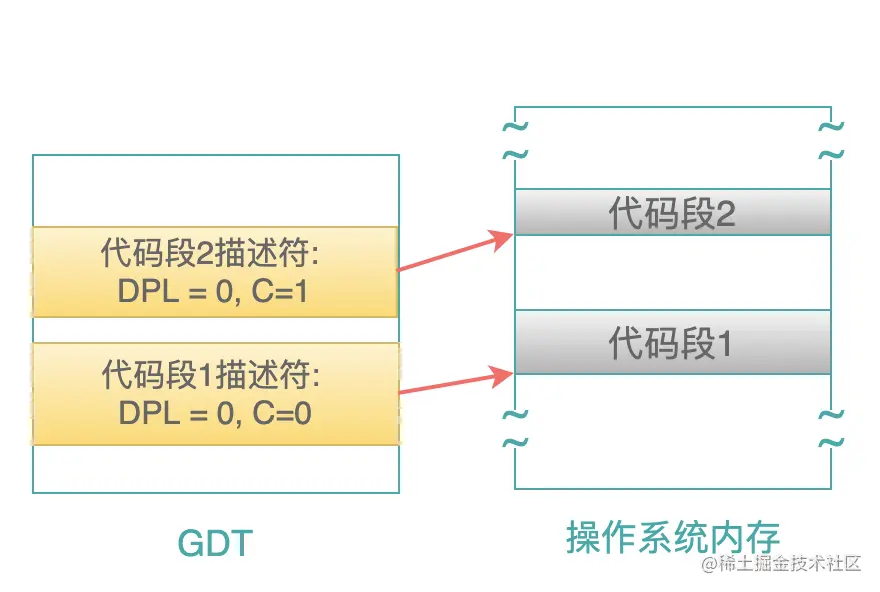 也即是说:如果 TYPE.C = 1,那么处理器就允许:比这个描述符的 DPL 更低特权级的代码,转移到这个代码中来执行。