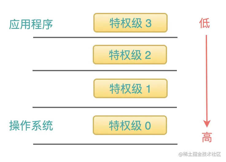 应用程序工作在最上层,来源广泛、可靠性最低,工作在 3 特权级别。