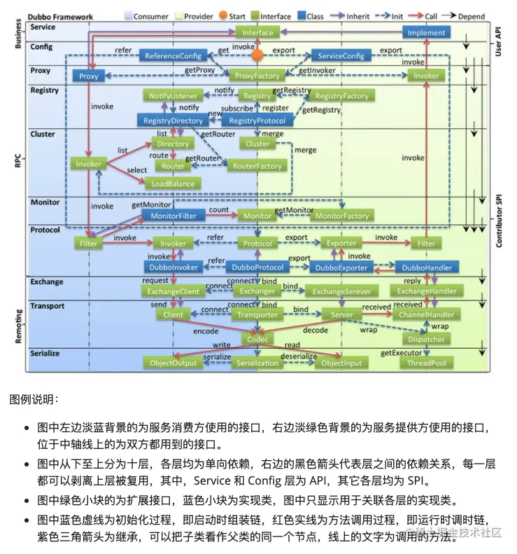 Dubbo这么分层的目的在于实现层与层之间的解耦,每一层都定义了接口规范,也可以根据不同的业务需求定制、加载不同的实现,具有极高的扩展性。