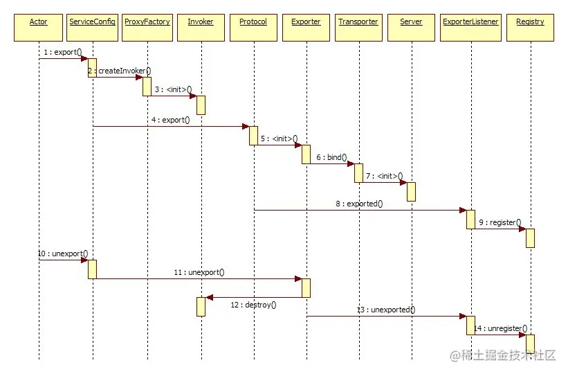 下图出自开发指南-框架设计-暴露服务时序,主要流程是:创建本地服务的代理Invoker,启动tcp服务暴露服务,然后将服务注册到注册中心。