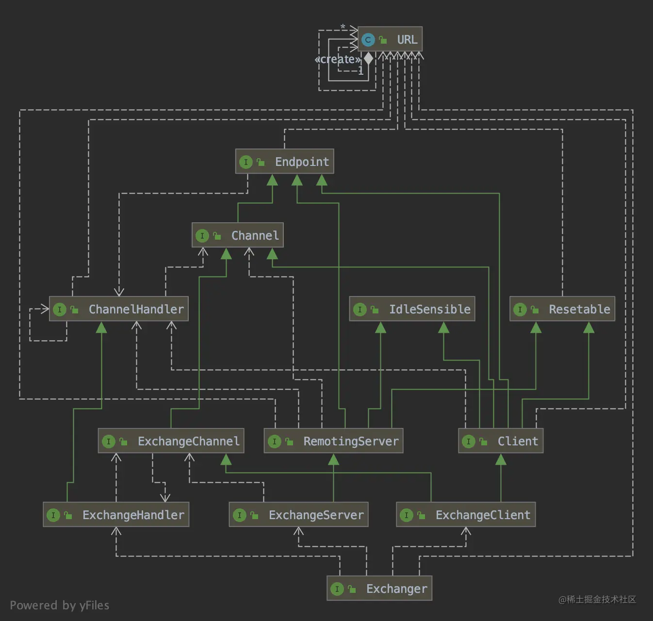 封装请求响应模式,同步转异步,以 Request, Response 为中心,扩展接口为 Exchanger, ExchangeChannel, ExchangeClient, ExchangeServer。
