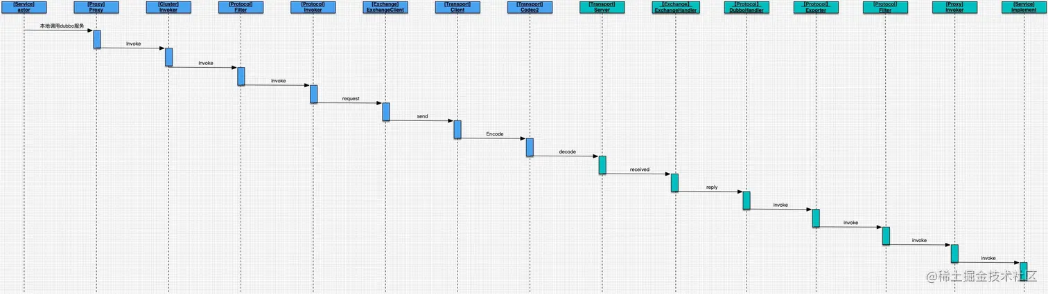 从Dubbo分层的角度看,详细时序图如下,蓝色部分是服务消费端,浅绿色部分是服务提供端,时序图从消费端一次Dubbo方法调用开始,到服务端本地方法执行结束。