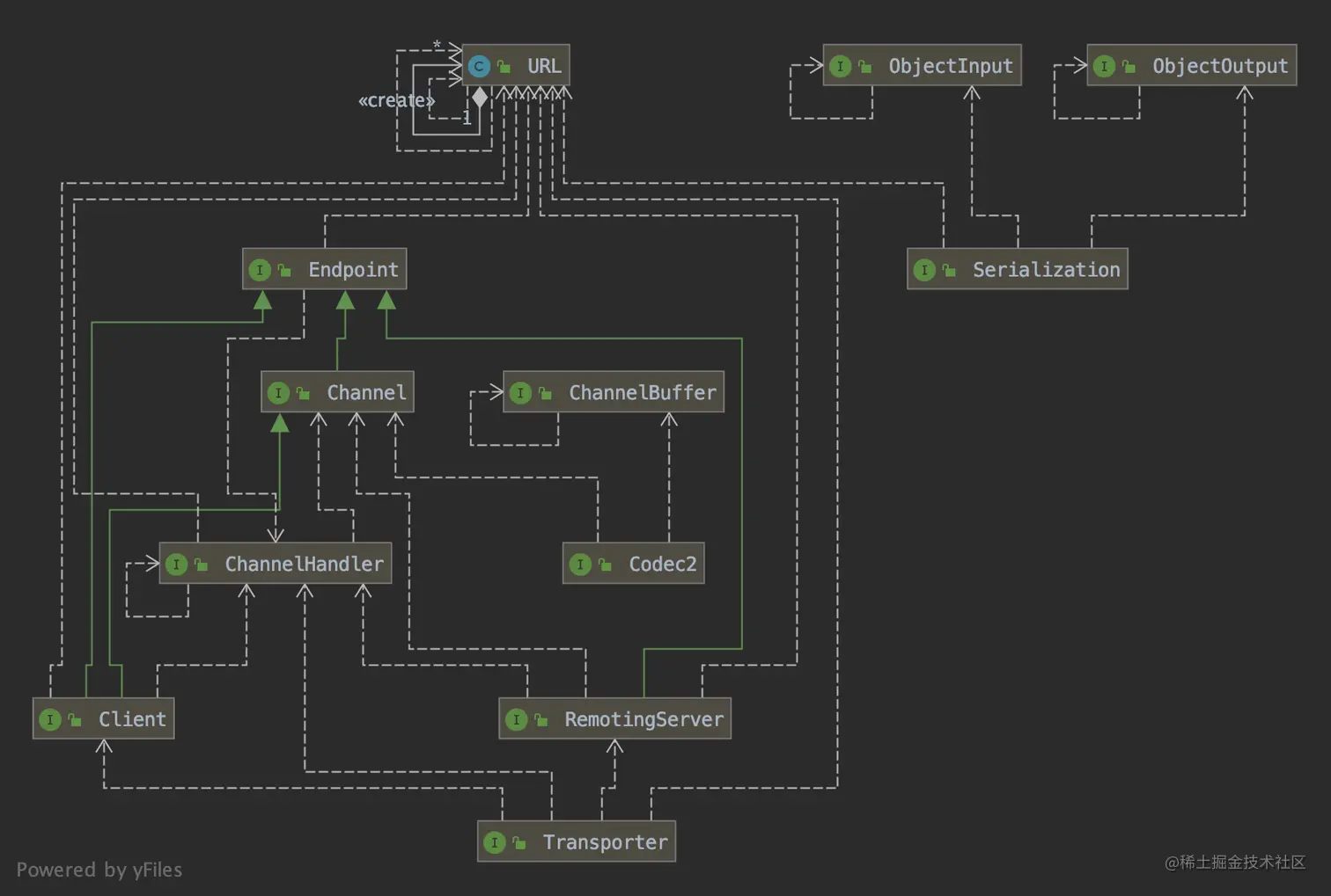 定义Serialization扩展点,默认hessian2,支持跨语言。Serialization接口实际是一个工厂接口,通过SPI扩展;实际序列化和反序列化工作由ObjectOutput,ObjectInput完成,通过装饰模式让hessian2完成实际工作。