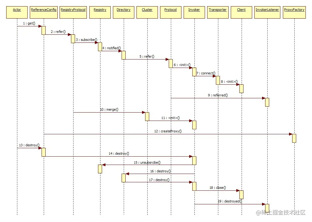 下图出自开发指南-框架设计-引用服务时序,主要流程是:从注册中心订阅服务提供者,然后启动tcp服务连接远端提供者,将多个服务提供者合并成一个Invoker,用这个Invoker创建代理对象。