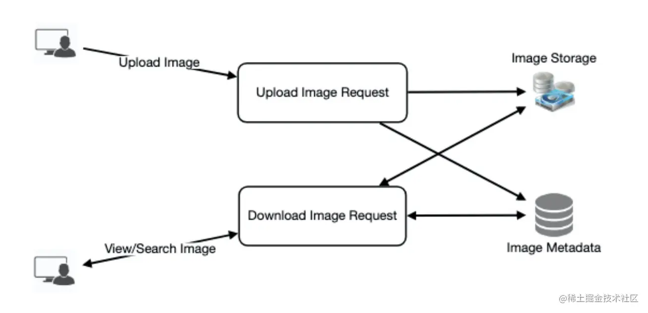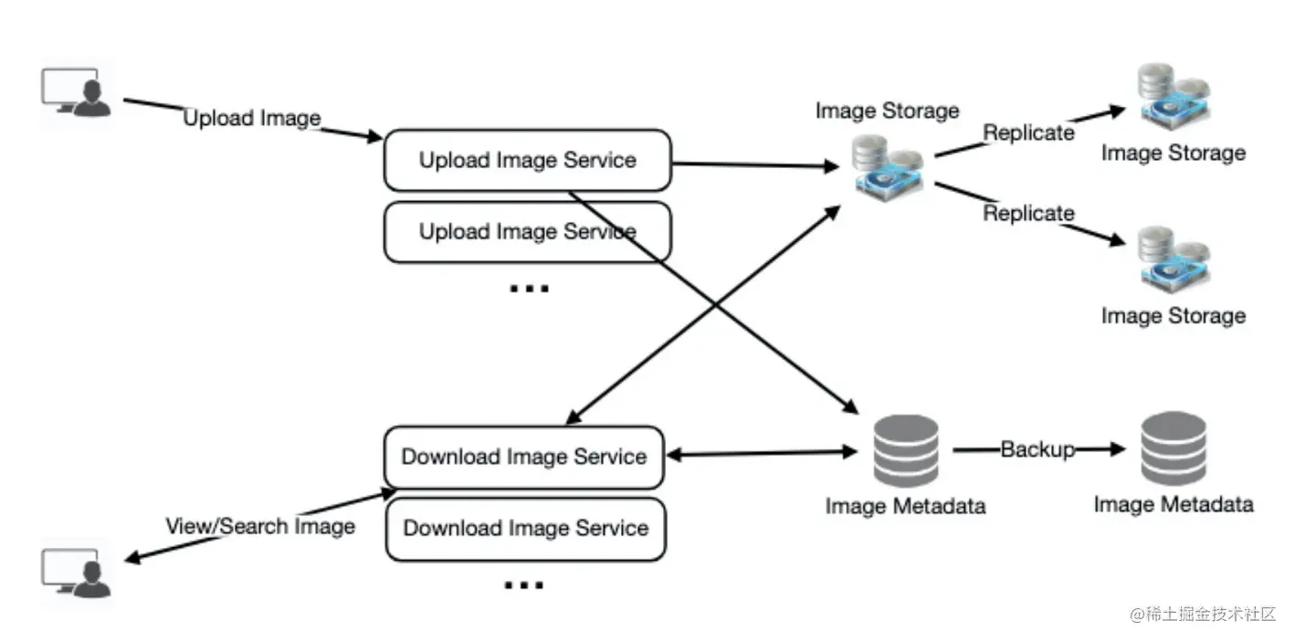 我们需要对象存储服务器来存储照片,还需要一些数据库服务器来存储关于照片的元数据信息。