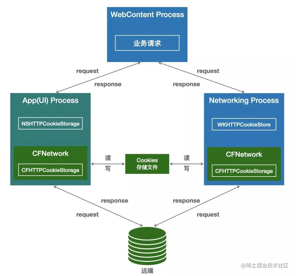 - 场景 1 - 未代理 WKWebView 网络请求:Cookie 完全由 Networking 进程管理,WKWebView 内可自闭环。大部分情况下 App 进程也无需感知,如果确实需要感知,可以根据业务场景选择 JS 桥接、强制持久化等方案。