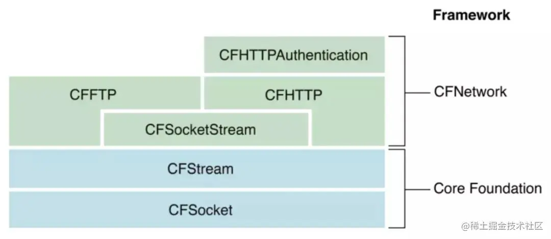 - CFNetwork:iOS 网络模块核心实现层,是网络层设计中最重要的部分。负责网络协议组装发送接收等主要工作,与 CoreFoundation 框架关系紧密。