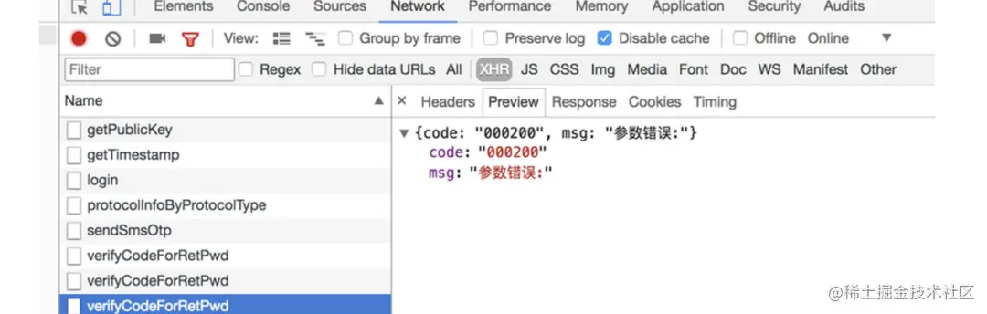 如下图是在network上的XHR上,在preview上查看传输字段,验证是否接口报错。
