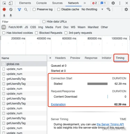 如果请求很慢往往是在Waiting(TTFB)占用很多时间。每个公司对响应速度要求不一样,但如果超过500ms,给用户体现是比较慢,这是可以向后台开发人员反馈问题。