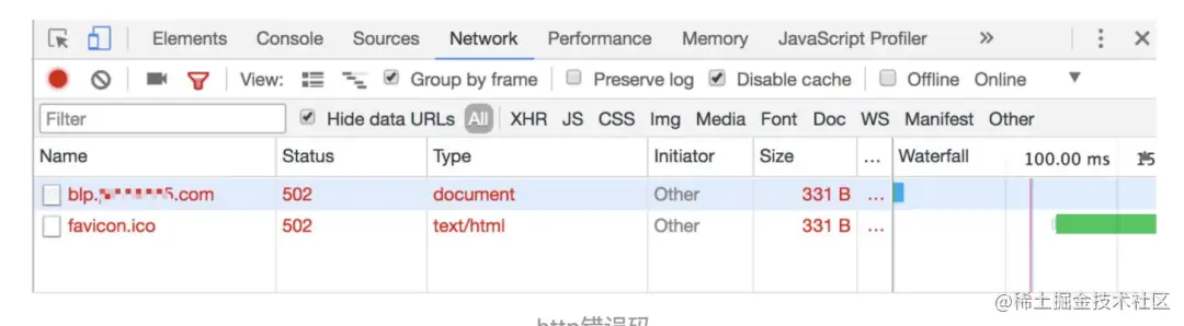 测试H5页面时,也可在调试器的Network中直接查看http返回的错误码,来判断问题发生的原因。如下图的Status报502,可断定是错误网关(服务器接收到来自上游服务器的无效响应)