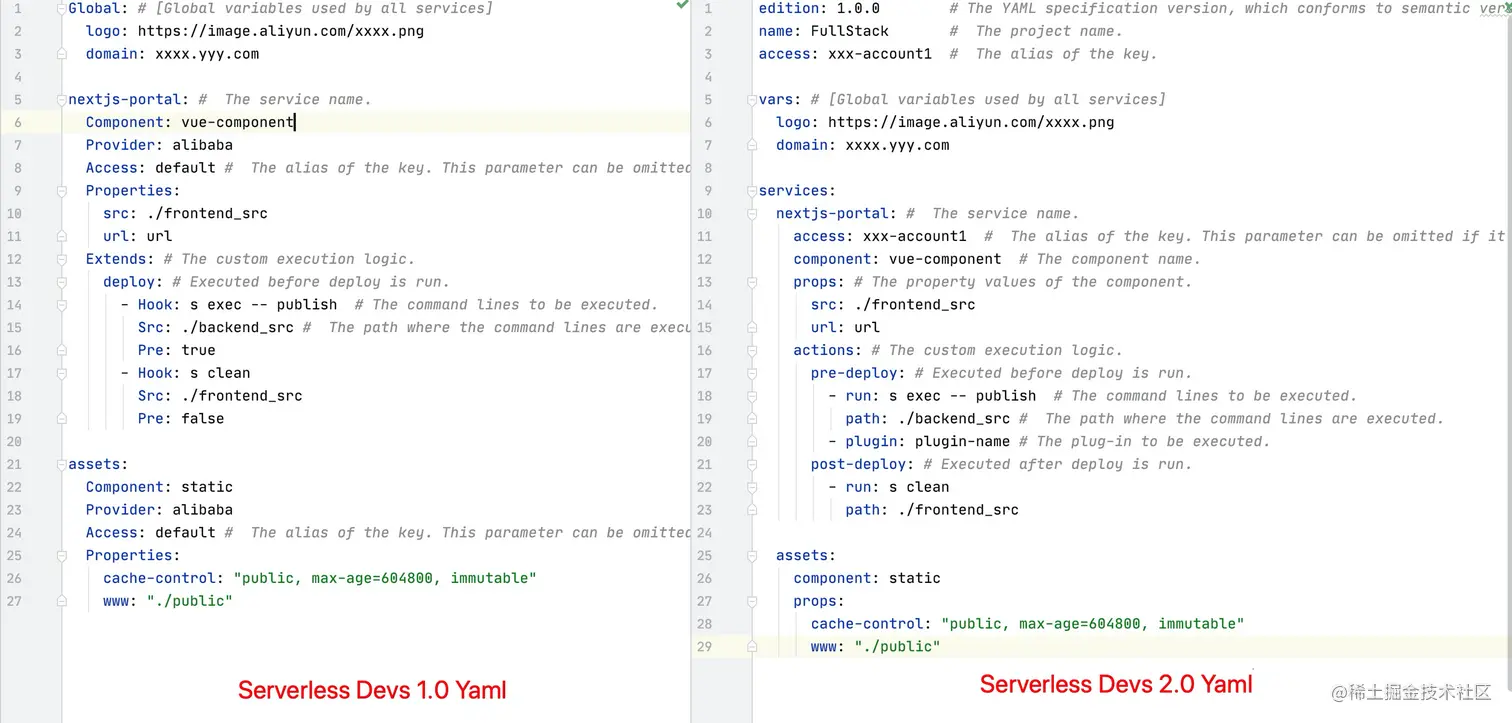 - 更易学习:Serverless Devs 2.0 全新 Yaml 规范,在一定程度上与现有的工具规范标准进行了部分的对齐,可以大幅度降低开发者学习难度,更易应用。
