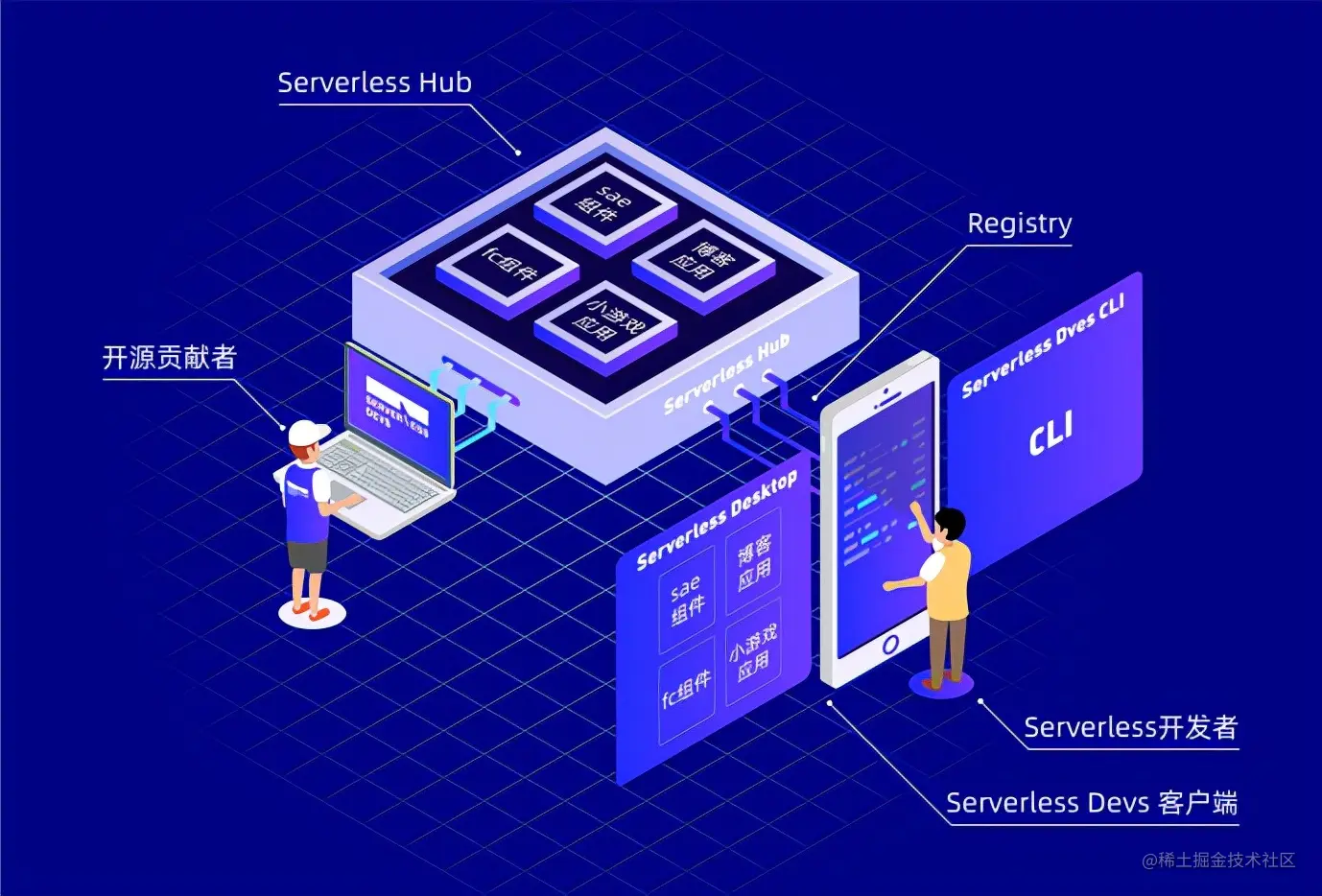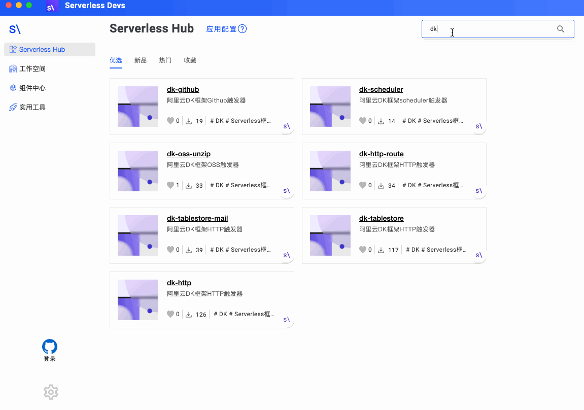 - Serverless Hub 应用中心,提供应用的集散和分发,作为公共服务提供给 开发者或贡献者适用。