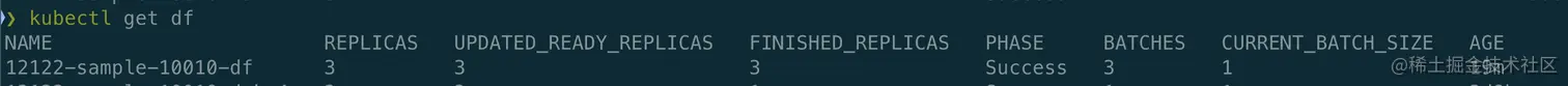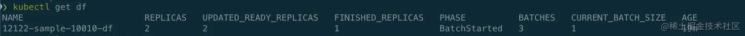 kubectl get df 12122-sample-10010-df -o yaml status: availableReplicas: 0 batches: 3 conditions: - batch: 1 batchSize: 1 canary: true failedReplicas: 0 finishedAt: null phase: Smoked pods: - ip: 172.31.230.23 name: 12122-sample-10010-2mwkt phase: ContainersReady port: 80 pullInStatus: "" pulledInAt: null startedAt: "2021-09-13T12:49:04Z" failedReplicas: 0 finished: false finishedAt: null finishedBatches: 0 finishedReplicas: 0 paused: false phase: BatchStarted pods: - 12122-sample-10010-2mwkt replicas: 1 replicasToProcess: 3 startedAt: "2021-09-13T12:49:04Z" updateRevision: 12122-sample-10010-6ddf9b7cf4 updatedAt: "2021-09-13T12:49:21Z" updatedReadyReplicas: 0 updatedReplicas: 1可以看到目前在启动的是