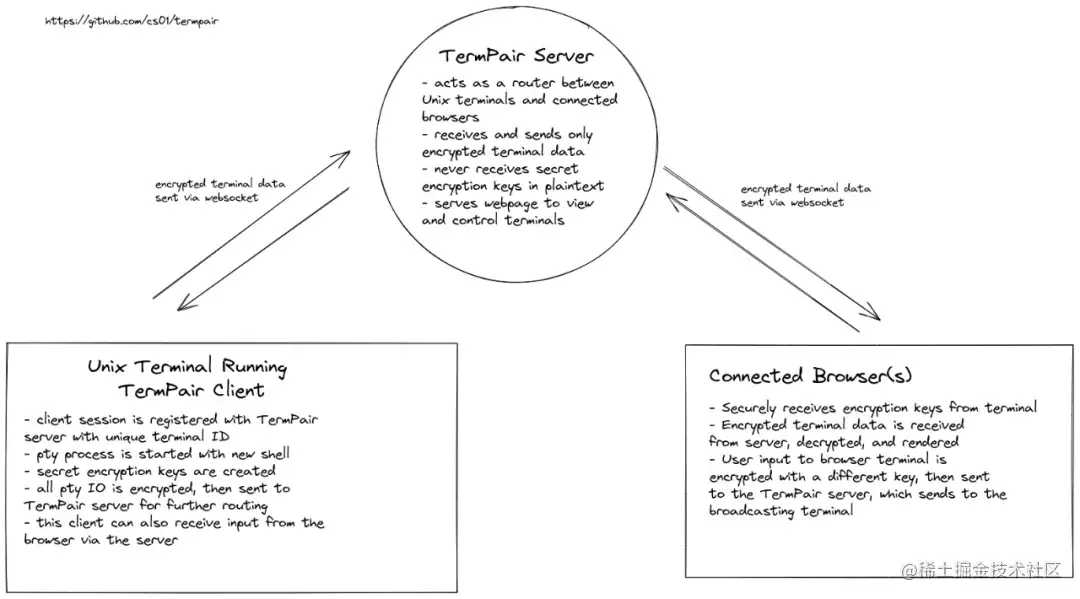 TermPair 客户端在共享会话期间为用户提供唯一的 URL。该 URL 指向 TermPair Web 应用程序(TypeScript/React),该应用程序设置 websocket 连接以接收和发送加密的终端数据。收到数据后,将其解密并写入基于浏览器的终端。