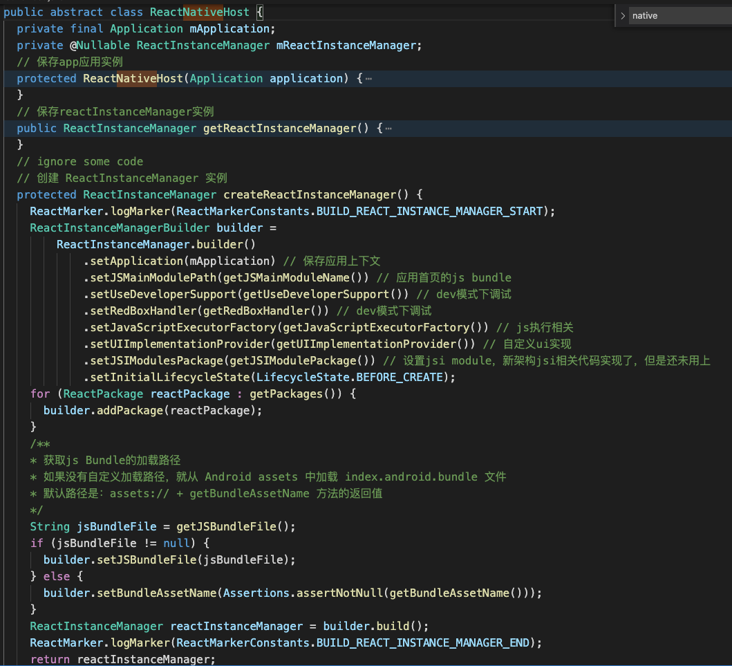 主要作用是保存当前的app的应用实例,并且从这其中能够新建一个reactInstanceManager,将一些初始化的参数传进去,可以理解为一个中转站