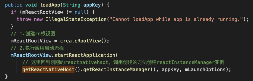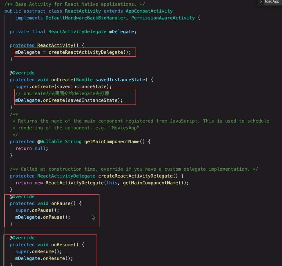 这里主要初始化了reactDelegate的实例,并且将当前的activity以及一些初始化参数传了进去,然后调用了reactDelegate的loadApp方法