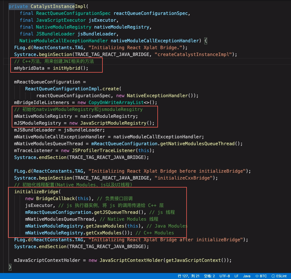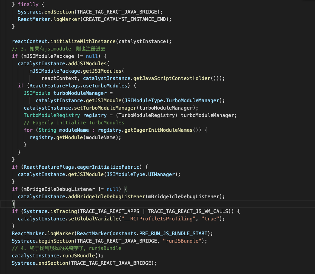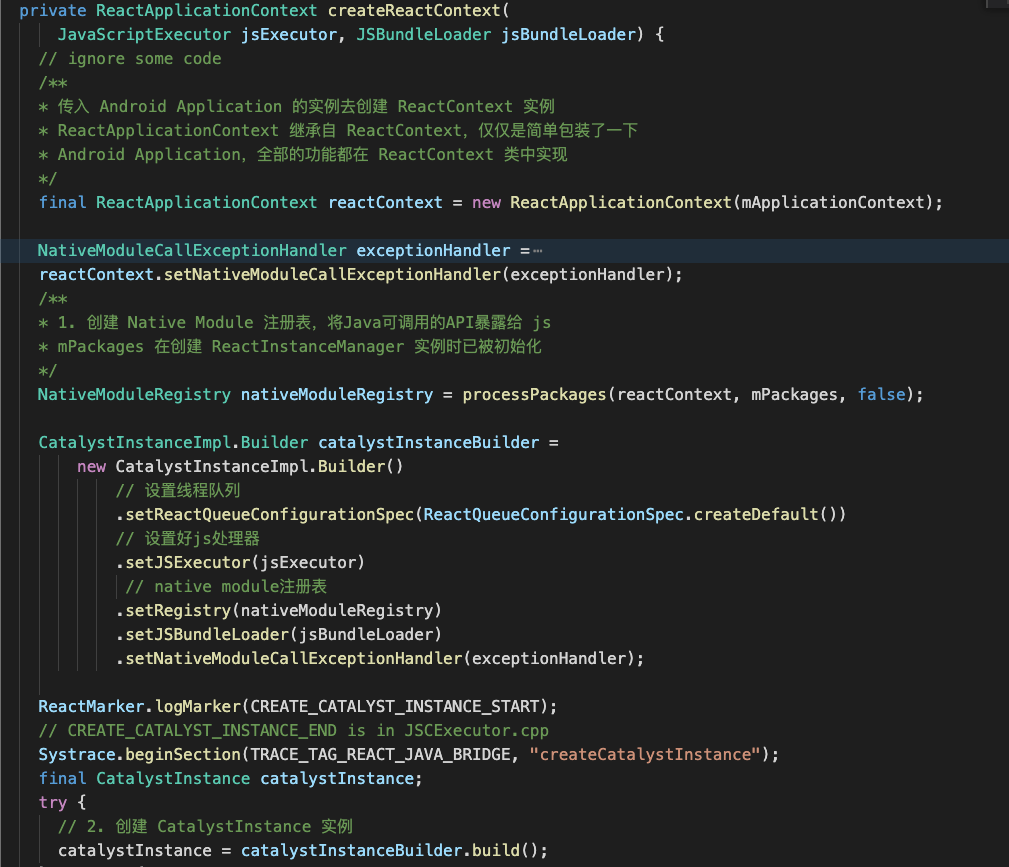 - 在这里会实例化CatalysInstanceImpl,CatalysInstanceImpl会注册需要暴露的原生模块以及要调用的js模块