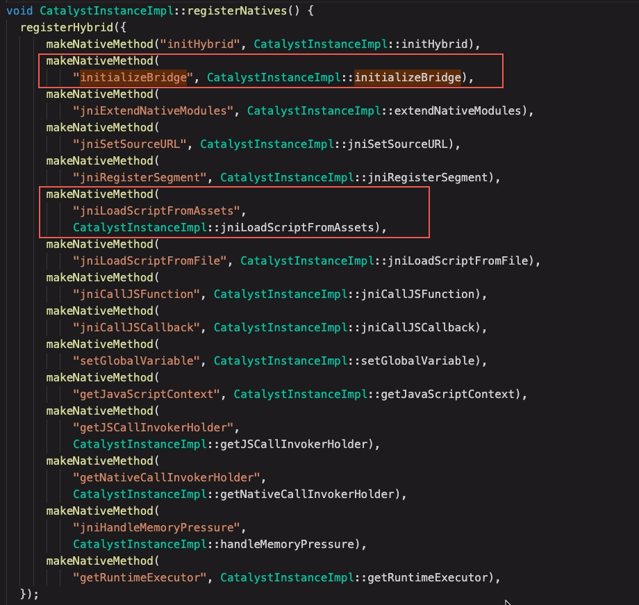 看到这里注册了一系列方法,里面有刚刚Java层调用的initializeBridge和jniLoadScriptFromAssets