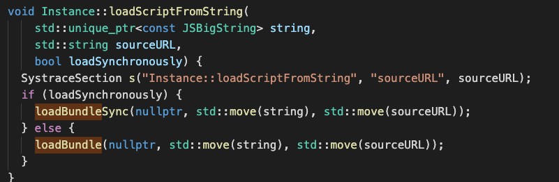 继续,最终通过调用链路instance::loadScriptFromString → loadBundle → nativeToJsBridge → JSIExcutor