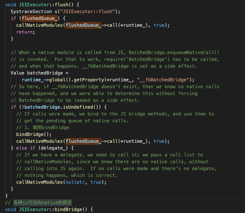 第二步是执行bindBrdige,这一步我们也先忽略,后面通信部分会讲,先记住这个方法名 bindBridge