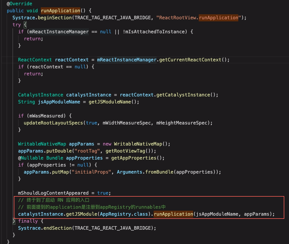 - 调用ReactRootView的startRactApplication去执行rn应用的启动流程