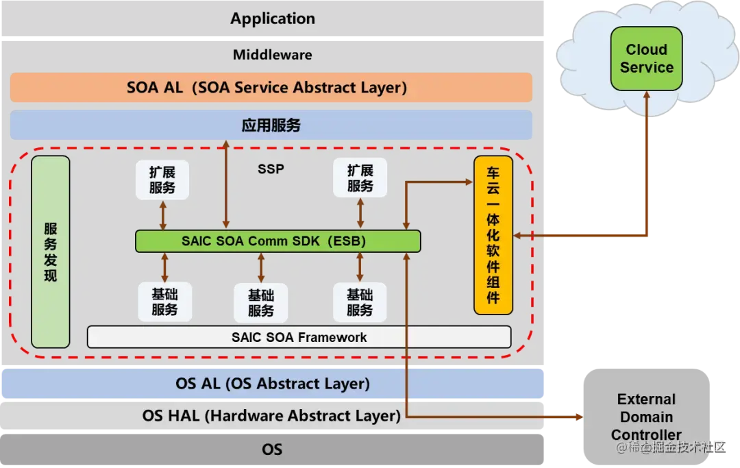 我们从另一个角度看过来,服务是SOA的主体,服务之间的关系构成了SOA软件架构。将服务比作砖石,那么SOA软件架构必然是参天大厦,而大厦不同的楼层,代表着服务之间的相互依赖、连接关系。即,SOA软件架构中,隐含着分层思想,服务是可分层的服务。上层服务使用下层服务,下层服务给上层提供能力支撑。通过将不同上层服务的需求抽离聚合,形成一个个下层服务,逐步迭代,最终形成SOA软件服务的分层架构。 目前,在新四化浪潮下,车辆联网的普及率非常高,所以我们设计的SOA软件架构包括车端SOA软件架构+云端软件架构。