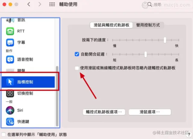 接着在「辅助使用」视窗左边的清单中往下拉,找到「指标控制」这个项目,点击后,在右边就可以看到一个「使用滑鼠或无线触控式轨迹板时忽略内建触控式轨迹板」的选项,将它勾选起来后,就可以暂时关闭处控制轨迹板了。