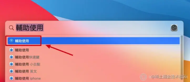 或者你也可以按下键盘上的Command + 空白键(有的人可能是Control + 空白键)叫出搜索工具Spotlight,然后直接搜索「辅助使用」,这样子就可以略过还要点击「系统偏好设置」再点击「辅助使用」项目的动作,直接进入到「辅助使用」这个设定里面。