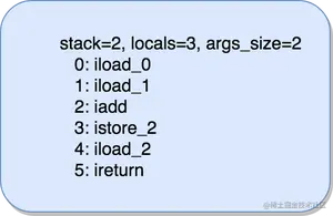 可以看到 add 方法本地变量表的大小是3,操作数栈的大小是2,参数的个数是2。共执行了6条指令。每条指令的含义如下: