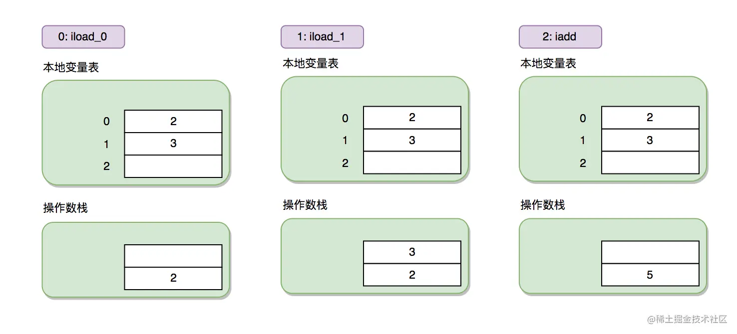 假如我们调用 add 方法,传入的两个参数分别是2和3,也就是计算2和3相加的值,我们来看一下本地变量表和操作数栈是如何变化的。