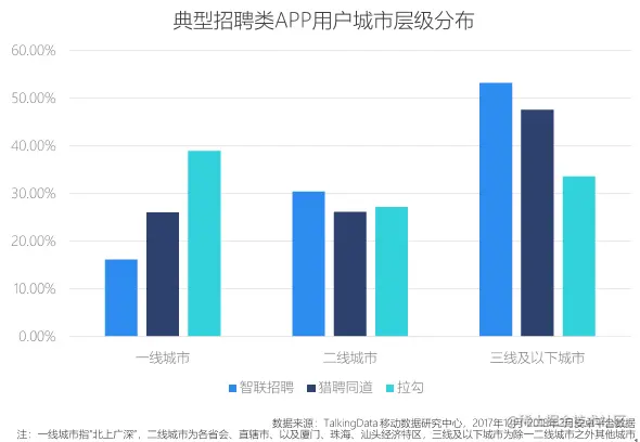 我们再来看看各个招聘平台的用户人群有什么不同。下面图片中对比了三个招聘类APP的用户,其中智联招聘、猎聘同道APP用户更多集中在三线及以下城市。而拉勾APP一线城市用户占比接近40%