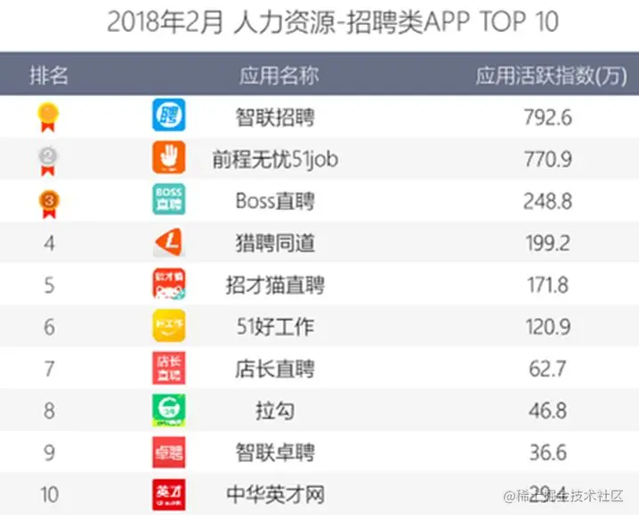 从表格中我们可以看出,2018年2月,传统综合招聘平台代表-智联招聘、前程无忧51job的APP应用活跃指数以较大领先优势居于招聘类APP前两位。