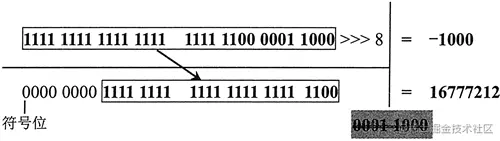 console.log(-1000 >> 8); //返回值 -4console.log(-1000 >>> 8); //返回值 16777212