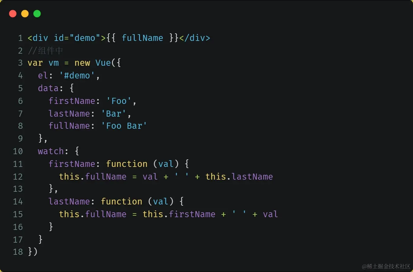 Vue 提供了一种更通用的方式来观察和响应 Vue 实例上的数据变动:侦听属性。当你有一些数据需要随着其它数据变动而变动时,你很容易滥用 watch——特别是如果你之前使用过 AngularJS。然而,通常更好的做法是使用计算属性而不是命令式的 watch 回调。细想一下这个例子: