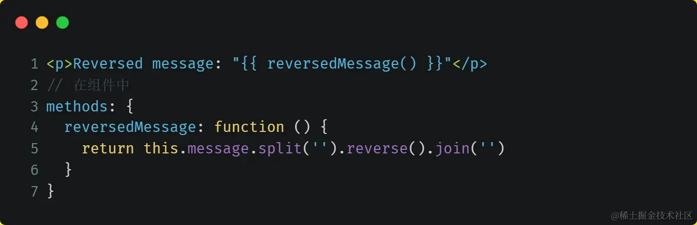 在这个地方,模板不再是简单的声明式逻辑。你必须看一段时间才能意识到,这里是想要显示变量 message 的翻转字符串。当你想要在模板中的多处包含此翻转字符串时,就会更加难以处理。