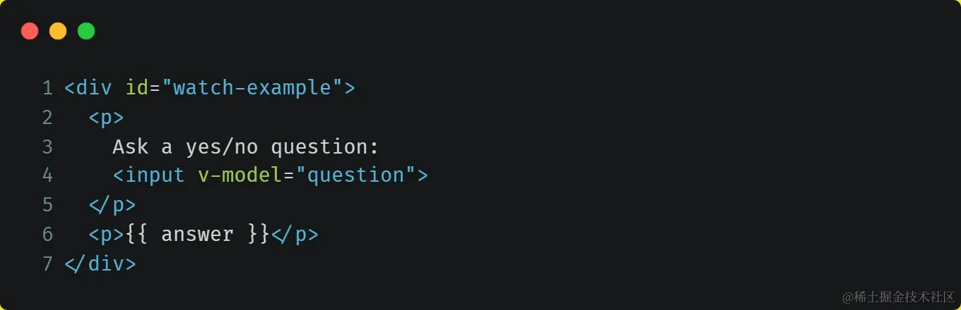 在这个示例中,使用 watch 选项允许我们执行异步操作 (访问一个 API),限制我们执行该操作的频率,并在我们得到最终结果前,设置中间状态。这些都是计算属性无法做到的。