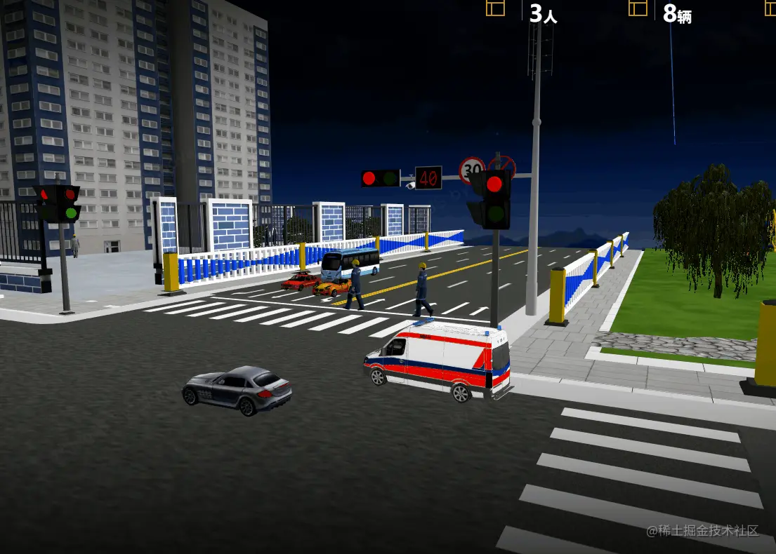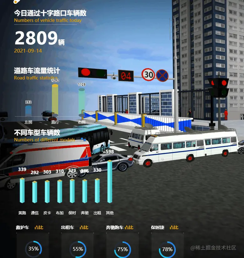 城市是一个复杂的体系,城市的实际运行涉及到不同维度、不同业务领域要素资源的协同合作,这里只是简单谈谈可视化动态呈现的效果。利用三维可视化技术与实际业务场景融合,采用更加直观、友好的展现形式,建设场景化的监控管理,打造十字路口车流量监控可视化系统。