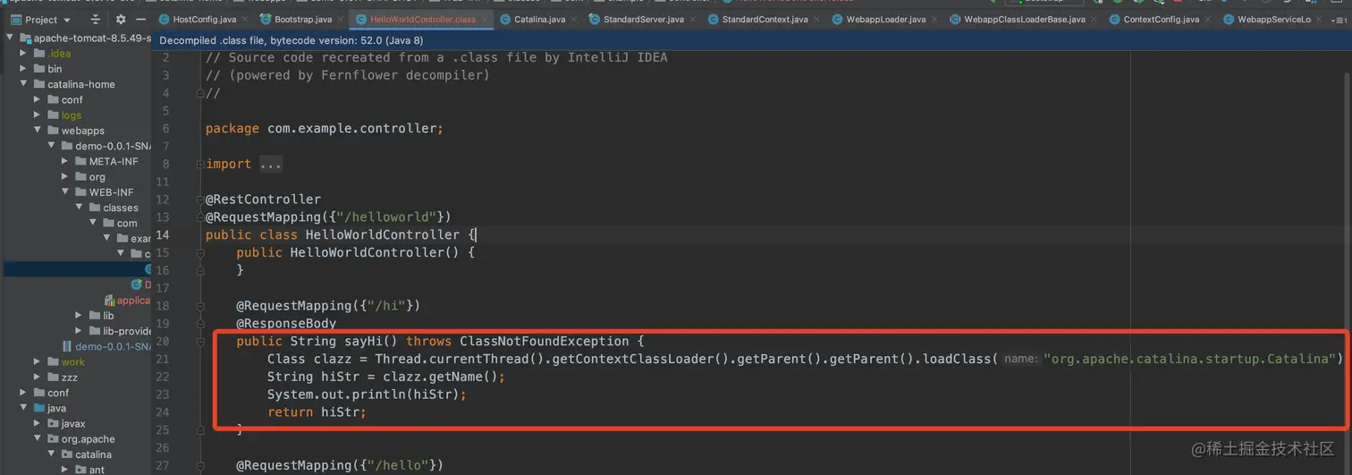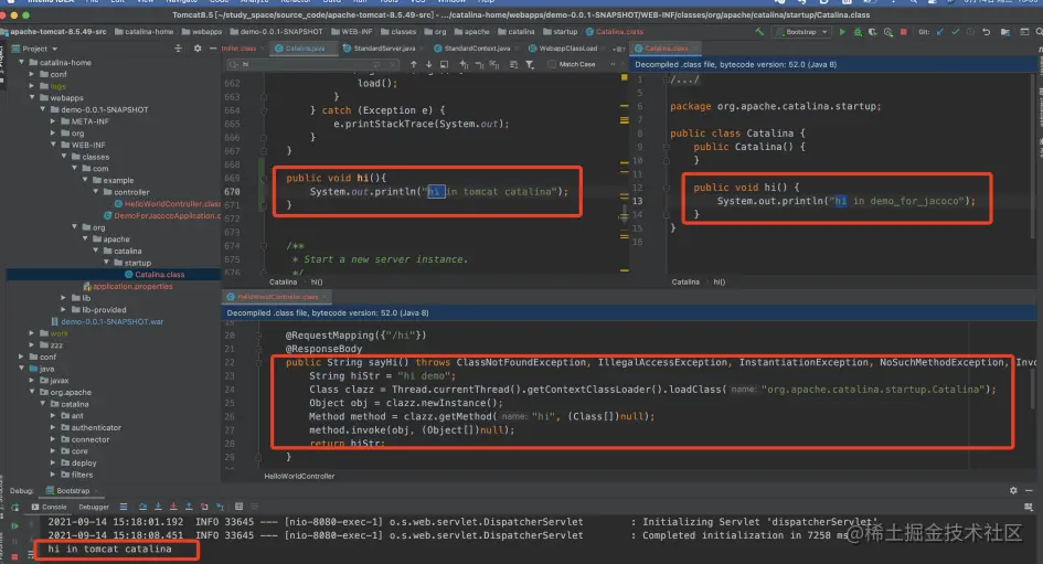 *在tomcat源码中Catalina.java中新增hi()方法;