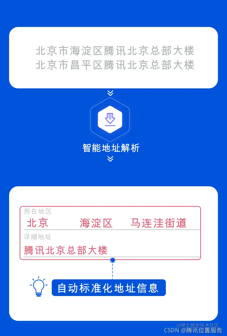 为了解决地址信息准确性和规范化的问题,腾讯位置服务凭借多年来深耕物流行业的丰富经验,以及庞大完整的地址库和行政区划信息,对外正式推出了智能地址解析接口。通过先进的地址关键信息提取技术,利用智能挖掘算法对地址信息进行标准化处理,将原本杂乱无章甚至错误的地址信息转换成准确的、符合物流公司规范的格式,从而提升物流公司的处理效率,降低逆向物流成本。