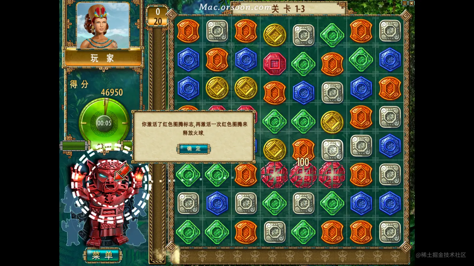 8. 进入下一关前,可以用金星购买能量图腾,每种图腾都有自己独特的能力。如红色图腾可以放出火球,桔色图腾可以延长时间。连续两次对同色小牌使用成队法就可以激活能量图腾。比如要激活火图腾,连续两次对红色小牌使用成队法即可。