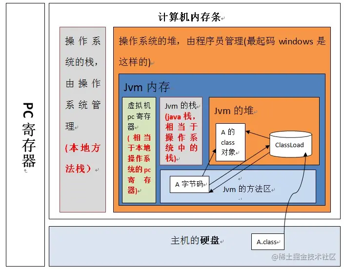 **上图表明:**jvm虚拟机位于操作系统的堆中,并且,程序员写好的类加载到虚拟机执行的过程是:当一个classLoder启动的时候,classLoader的生存地点在jvm中的堆,然后它会去主机硬盘上将A.class装载到jvm的方法区,方法区中的这个字节文件会被虚拟机拿来new A字节码(),然后在堆内存生成了一个A字节码的对象,然后A字节码这个内存文件有两个引用一个指向A的class对象,一个指向加载自己的classLoader