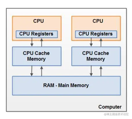 **在CPU内部有一组CPU寄存器,也就是CPU的储存器。CPU操作寄存器的速度要比操作计算机主存快的多。在主存和CPU寄存器之间还存在一个CPU缓存,CPU操作CPU缓存的速度快于主存但慢于CPU寄存器。某些CPU可能有多个缓存层(一级缓存和二级缓存)。计算机的主存也称作RAM,所有的CPU都能够访问主存,而且主存比上面提到的缓存和寄存器大很多。 当一个CPU需要访问主存时,会先读取一部分主存数据到CPU缓存,进而在读取CPU缓存到寄存器。当CPU需要写数据到主存时,同样会先flush寄存器到CPU缓存,然后再在某些节点把缓存数据flush到主存。