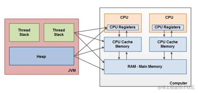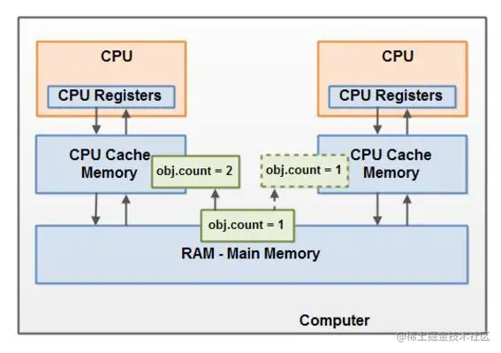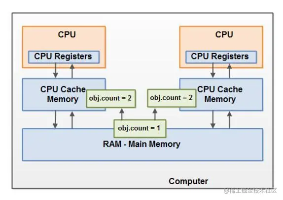 想象一下我们的共享对象存储在主存,一个CPU中的线程读取主存数据到CPU缓存,然后对共享对象做了更改,但CPU缓存中的更改后的对象还没有flush到主存,此时线程对共享对象的更改对其它CPU中的线程是不可见的。最终就是每个线程最终都会拷贝共享对象,而且拷贝的对象位于不同的CPU缓存中。