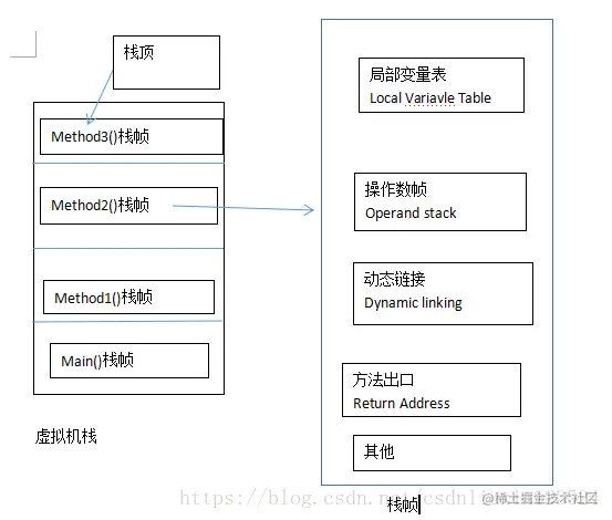 Java虚拟机栈(Java Virtual Machine Stack):(1)线程私有的,它的生命周期与线程相同,每个线程都有一个。(2)每个线程创建的同时会创建一个JVM栈,JVM栈中每个栈帧存放的为当前线程中局部基本类型的变量(java中定义的八种基本类型:boolean、char、byte、short、int、long、float、double;和reference (32 位以内的数据类型,具体根据JVM位数(64为还是32位)有关,因为一个solt(槽)占用32位的内存空间 )、部分的返回结果,非基本类型的对象在JVM栈上仅存放一个指向堆上的地址;(3)每一个方法从被调用直至执行完成的过程就对应着一个栈帧在虚拟机栈中从入栈到出栈的过程。(5)栈运行原理:栈中的数据都是以栈帧(Stack Frame)的格式存在,栈帧是一个内存区块,是一个数据集,是一个有关方法和运行期数据的数据集,当一个方法A被调用时就产生了一个栈帧F1,并被压入到栈中,A方法又调用了B方法,于是产生栈帧F2也被压入栈,B方法又调用了C方法,于是产生栈帧F3也被压入栈…… 依次执行完毕后,先弹出后进......F3栈帧,再弹出F2栈帧,再弹出F1栈帧。(6)JAVA虚拟机栈的最小单位可以理解为一个个栈帧,一个方法对应一个栈帧,一个栈帧可以执行很多指令