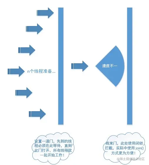 与 CountDownLatch 有类似功能的,还有个工具栅栏 CyclicBarrier, 也是提供一个等待所有线程到达某一点后,再一起开始某个动作,效果一致,不过栅栏的目的确实比较纯粹,就是等待所有线程到达,而前面说的闭锁 CountDownLatch 虽然实现的也是所有线程到达后再开始,但是他的触发点其实是 最后那一个开关,所以侧重点是不一样的。