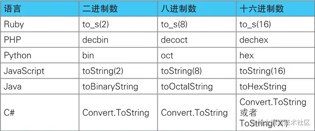 很多语言都提供了把整数转换成二进制数或者八进制数的方法法。表 2 汇总了代表性语言的相关函数或者方法,不过 C 语言并没有提供直接转换的接口