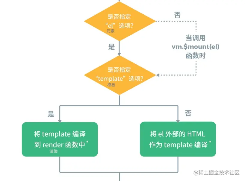 如果“yes”判断是否有指定template模板。如果有template模板,先渲染模板(将template编译到render函数中),否则就编写#app下的html模板(el外部的html作为template编译)。这一部分执行完成后,把data数据拿到后,并且解析执行模板结构中的指令;当所有指令被解析完毕后,那么页码就会渲染到内存中了;当模板编译完成后,我们的模板页面,还没有挂载到页面上,只是在内存中,用户看不到。